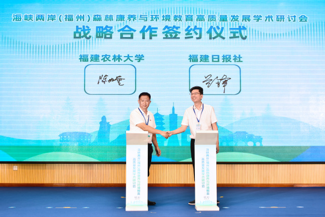 会上,陈世奎、兰锋分别代表福建农林大学、福建日报社签订战略合作协议。双方将发挥各自优势,在新闻宣传、品牌活动、人才交流、智慧融媒建设、理论研究等五个方面深化合作,通过全媒体矩阵推广森林康养理念,让更多人了解并受益于绿色健康的生活方式,推动森林康养事业迈向新高度。