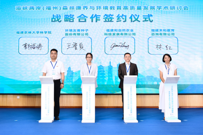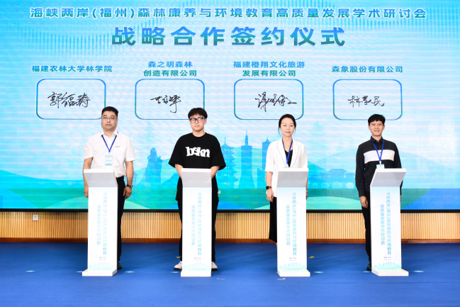 福建农林大学林学院执行院长郭福涛代表学院与环境友善种子股份有限公司、福建和自然农业科技发展有限公司、福建禾和教育咨询有限公司、森之明森林創造有限公司、福建橙翔文化旅游发展有限公司、森象股份有限公司等6家台资企业代表签订了战略合作协议。会上还成立了两岸森林康养产业联盟,此举既为森林康养与环境教育学科发展注入新动能,也为台胞台企参与大陆生态产业提供合作契机,助力打造两岸共同的“绿色家园”。