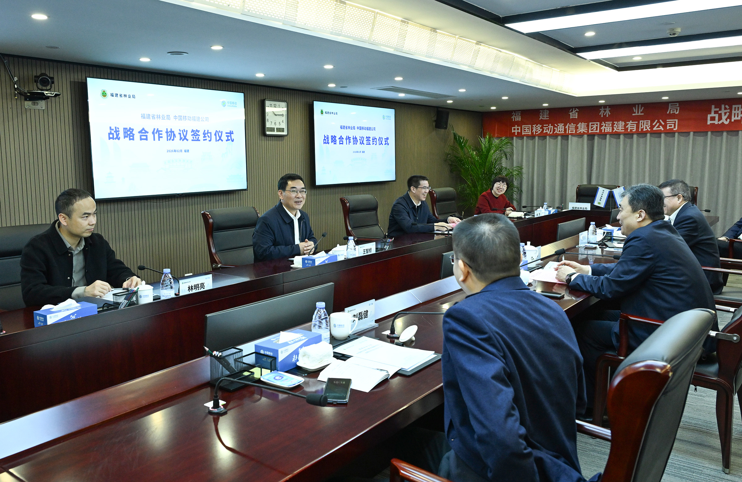 2月11日上午,福建省林业局与中国移动福建公司在福州举行战略合作协议签约仪式。局党组书记、局长王智桢与中国移动福建公司党委书记、董事长、总经理姜峰出席签约仪式并见证签约;局党组成员、副局长石家泉与福建移动党委委员、副总经理刘磊健分别代表双方签署协议。活动当天,双方共同参观了机器人展馆,了解移动发展历程,观看了无人机在林业应用试点和机器狗现场演示,并就数字化赋能林业发展方面进行了深入交流和探讨。